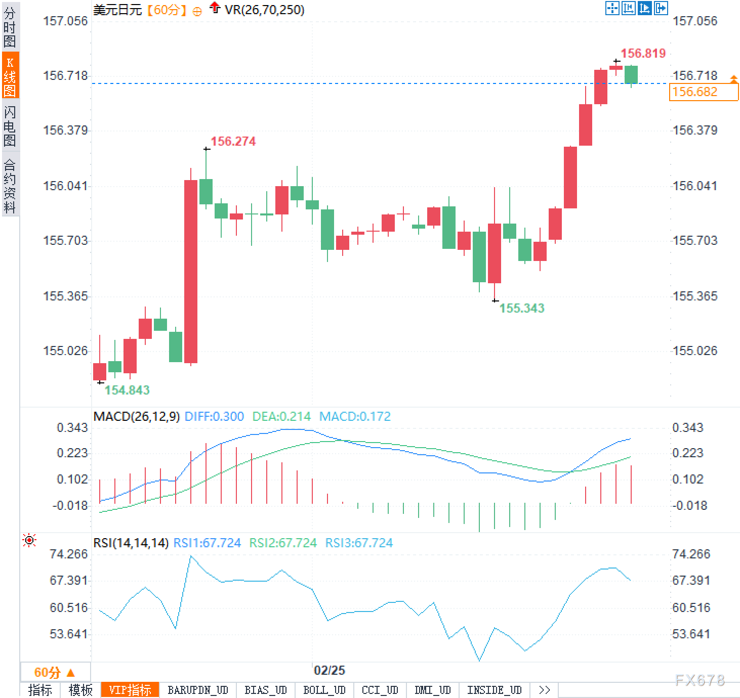 从技术面观察,60分钟图显示美元兑日元在触及154.843低点后逐步抬升,近期更是加速拉升并触及156.819的高位。MACD指标显示上行动能仍占优但已进入偏强区间,RSI指标位于67.724附近,虽未达极端但多头优势明显。这意味着汇价存在惯性延伸的可能,但也面临高位整理的压力。若出现回调,155.343一带是重要的支撑参考;向上则需关注156.80附近的压力能否被有效消化。只有在高位站稳,趋势延续的确定性才会进一步提高。